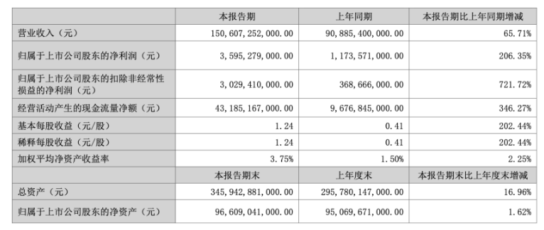 2022年上半年,比亚迪实现营业收入1506.07亿元,同比增长65.71%;归母净利润35.95亿元,同比增长206.35%;基本每股收益1.24元。其中,汽车、汽车相关产品及其他产品业务的收入约1092.67亿元,同比增长130.31%。