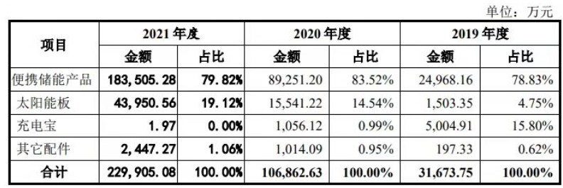 具体业务来看,华宝新能目前的主营业务可分为四大项:便携储能产品、太阳能板、充电宝与其他配件。其中,华宝能源近三年的飞速增长,离不开便携式储能产品的放量带动。