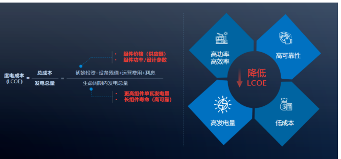 另一方面看分母,增加电站生命周期内发电总量也是降低光伏发电度电成本的关键。总发电量首先取决于单瓦发电能力,其次是产品可持续、高可靠型,能否长久发电。高发电量、高可靠性组件产品直接增加电站项目全生命周期的发电总量,使分母变大。分子越小,分母越大,比值度电成本就可持续降低。