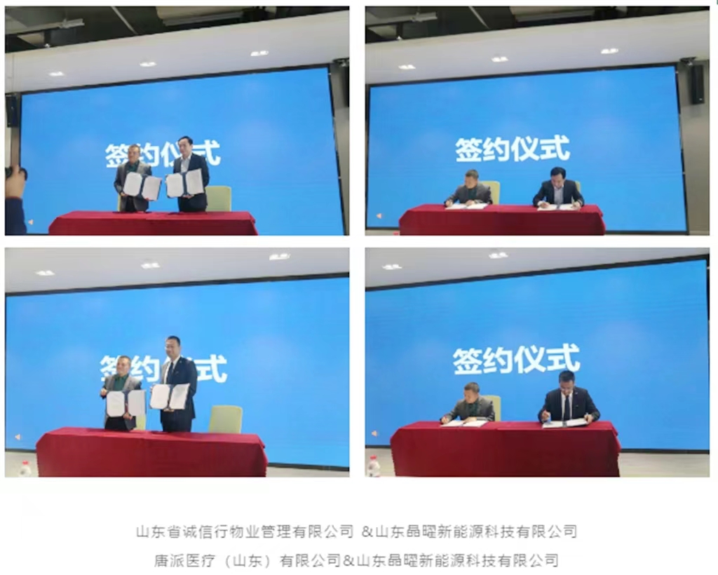 2022年10月7日,山东晶曜新能源科技有限公司与山东省诚信行物业管理有限公司、唐派医疗(山东)有限公司的新能源业务合作签约仪式在中欧校友产业大厦五楼盛大举行。