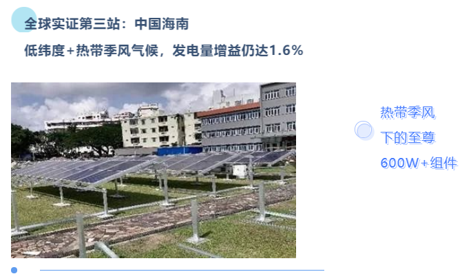 在以中国海南为代表的低纬度地区,日均气温高,天气潮湿,至尊600+W组件仍然能发挥优异的发电性能,为用户带来更高的发电量。