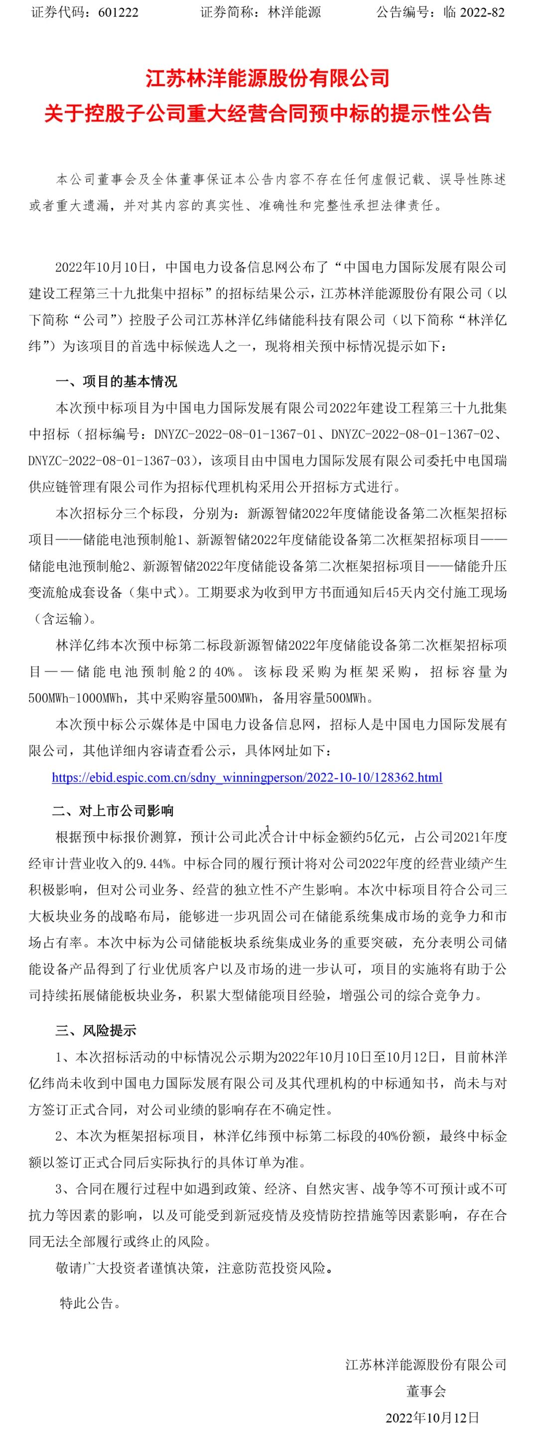 10月11日晚间,林洋能源(601222.SH)发布公告,公司控股子公司江苏林洋亿纬储能科技有限公司预中标“中国电力国际发展有限公司建设工程第三十九批集中招标”项目,预估中标总金额约5亿元。这是林洋能源储能业务继今年5月份中标2.74亿元中能建风电配套储能设备采购项目后的第二个超亿元订单!