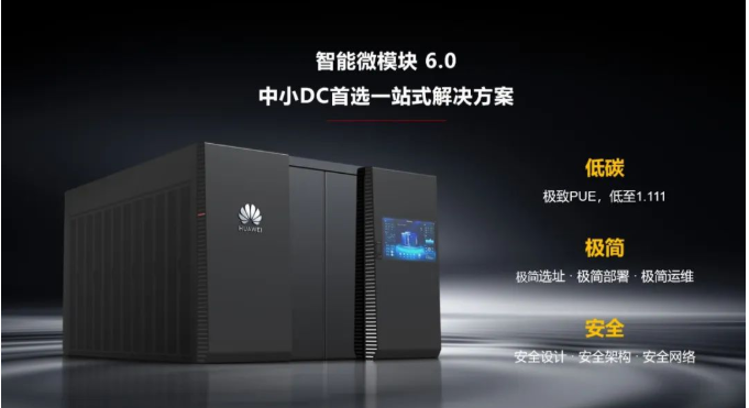 首先,针对中小数据中心能效水平低、场景复杂性高、管理难度大和故障率高等难题。华为提出了低碳、极简、安全的设计理念,通过低PUE、低排放,打造绿色低碳的数据中心,以极简的设计理念,实现数据中心的极简选址、极简部署和极简运维,并通过设备安全、架构安全和软件安全,打造数据中心的极致安全。