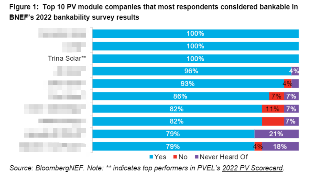 BNEF以公司的财务健康状况、光伏组件在项目上的跟踪数据以及制造厂商的质保为重要评估指标,向全球银行、基金、工程总承包以及独立发电厂等机构发送调查问卷,并与质量检测及技术专家进行深度访谈,调查覆盖范围广,评估公开透明。BNEF是全球新能源市场最具公信力的第三方研究机构之一,其报告长期以来是众多金融机构在商业信贷方面的重要参考依据。