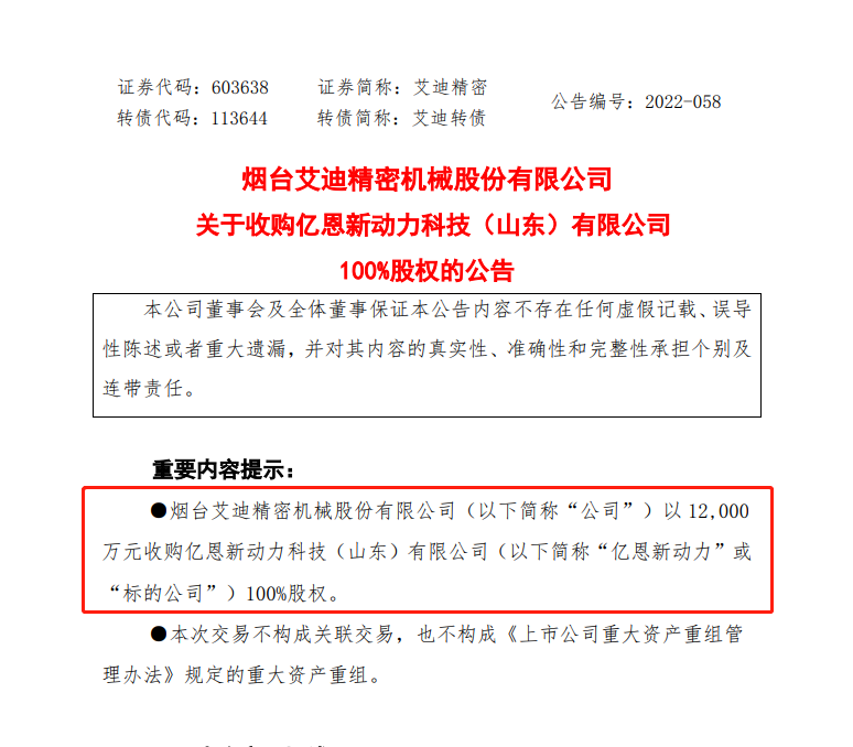11月15日晚间,艾迪精密(603638.SH)发布公告称,公司以1.2亿元收购亿恩新动力科技(山东)有限公司(简称“亿恩新动力”)100%股权。