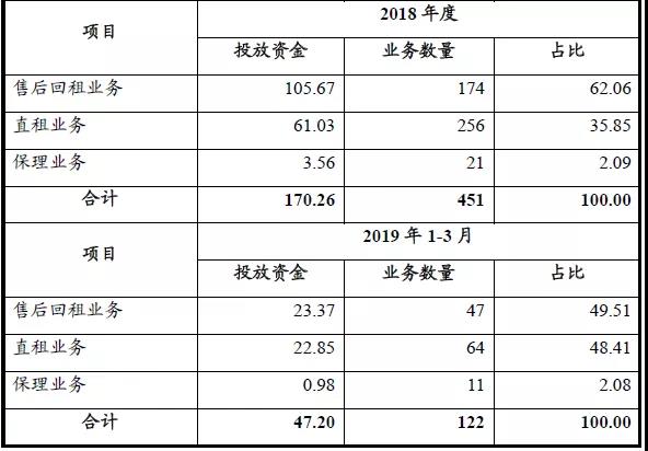 2019年一季度,融和租赁总共发放111笔融资租赁业务,投放资金累计46.22亿元。其中:售后回租业务47笔,投放资金23.37亿元;直租业务64笔,投放资金为22.85亿元。