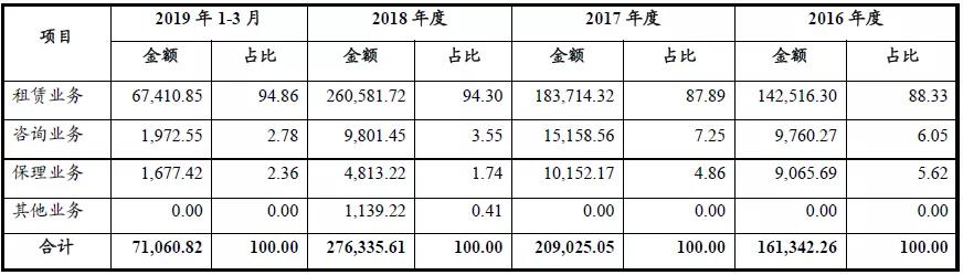 融和租赁营业收入主要由融资租赁利息、咨询服务费以及保理利息等三部分组成。2019年三季度营业收入为7.11 亿元。2018年末营业收入较 2017年末增加 6.73亿元,增幅达到32.20%,主要是融和租赁各项业务规模迅速扩张。其中,2019年三季租赁业务贡献的收入占营业收入合计的94.86%,占比较高,融和租赁的融资租赁业务主要采用直接租赁以及售后回租形式展开。