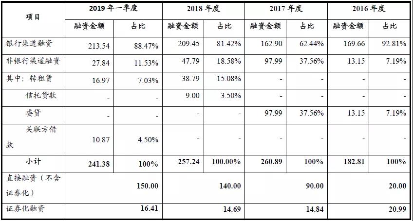 融和租赁的资金来源主要包括银行渠道融资和非银行渠道融资。2018年平均融资成本4.52%,其中银行渠道融资平均融资成本为4.51%、非银行渠道融资平均融资成本为4.19%(转租赁平均融资成本为4.04%、信托贷款平均融资成本为4.81%)、直接融资(不含证券化)平均融资成本为4.56%、证券化融资平均融资成本5.35%;2019年一季度的融资金额分别为213.54亿元、27.84亿元和166.41亿元。