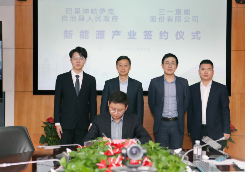 11月29日,三一重能股份有限公司(简称”三一重能“)与新疆哈密市巴里坤哈萨克自治县人民政府(简称”巴里坤县“)举行线上云签约仪式。巴里坤县委副书记、县人民政府县长瓦里汗与三一重能副总经理、营销公司总经理余梁为代表双方在招商引资协议上签字。