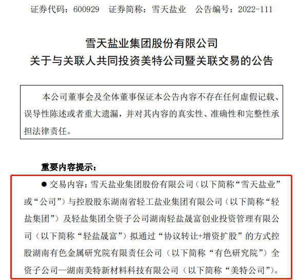 11月26日,盐业龙头雪天盐业(600929.SH)发布公告称,公司与控股股东轻盐集团及轻盐集团全资子公司轻盐晟富,拟通过“协议转让+增资扩股”的方式,控股湖南有色金属研究院全资子公司——湖南美特新材料科技有限公司(简称“美特新材料”)。