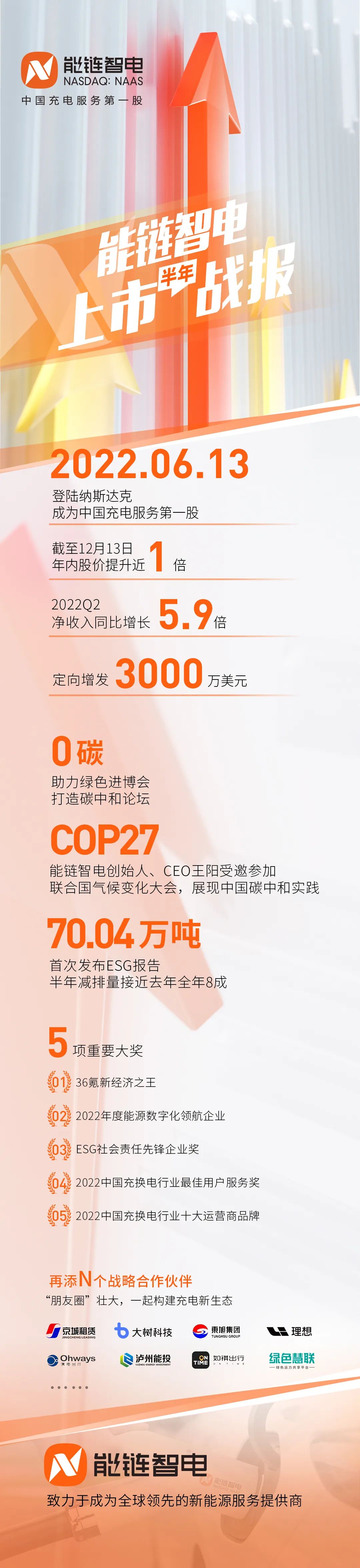 2022年6月13日,能链智电(NASDAQ:NAAS)正式跨入资本市场,成为中国充电服务第一股,今日已满半周年,取得了一定的成绩,特此呈上半年战报: