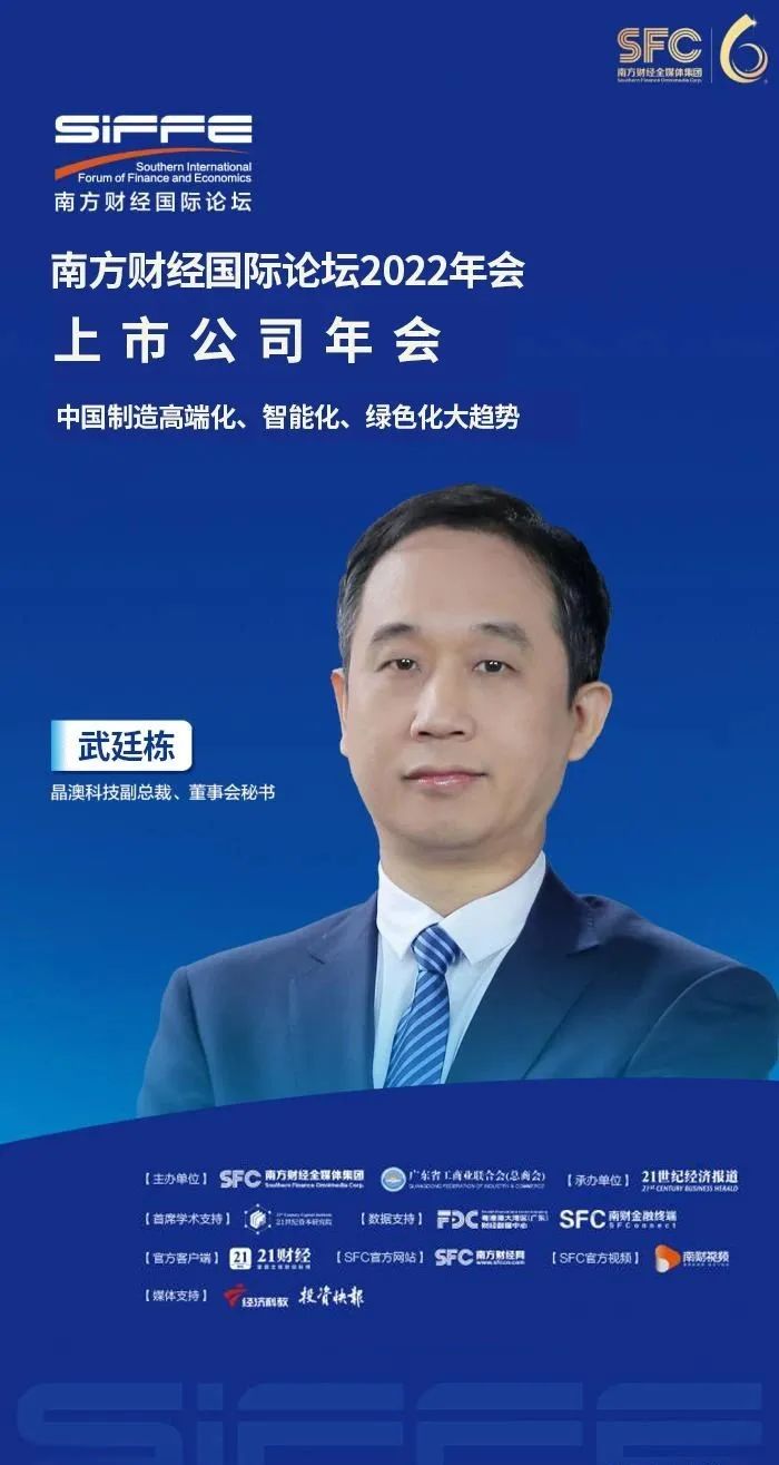 近日,由南方财经全媒体集团主办,21世纪经济报道承办的南方财经国际论坛2022年会上市公司年会成功举办。会上,晶澳科技副总裁、董事会秘书武廷栋发表主题为:“低碳转型推动企业可持续、高质量发展”的演讲,分享了晶澳科技高端化、智能化、绿色化产业转型升级的探索和实践。