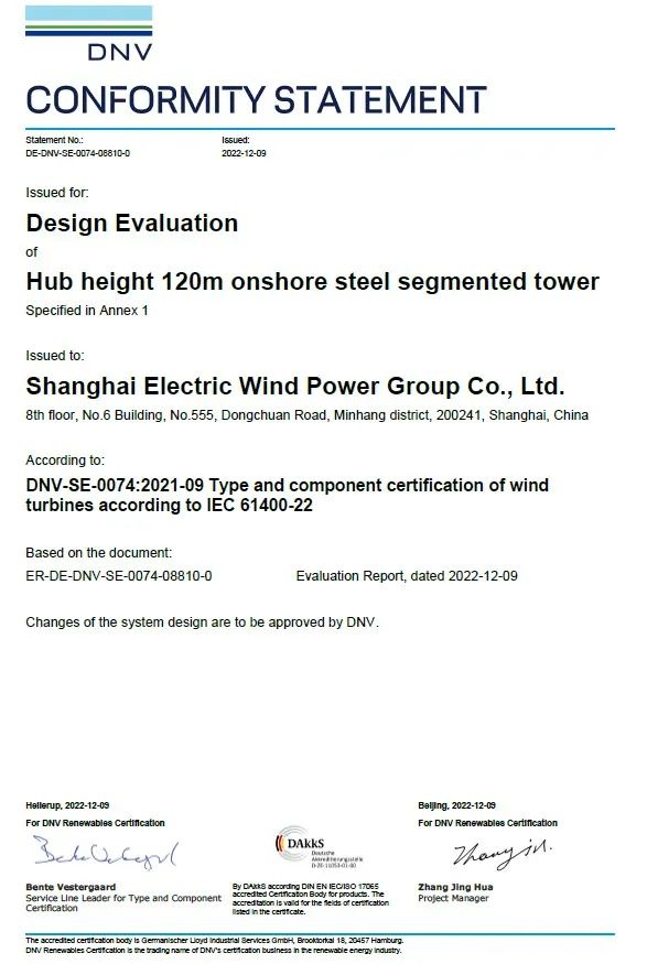 与此同时,DNV总部技术专家依据多项国际标准及欧洲标准,对本产品进行了全面认证,特别是对于全钢分片塔架的计算进行了严格审核,全面验证了电气风电全钢分片塔架的安全性及可靠性。