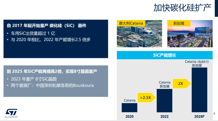 为满足汽车市场对碳化硅器件的爆发式需求,意法半导体一直在持续稳定地扩大产能,其2022年碳化硅产能是2020年的2.5倍多,2025年产能将在2022年基础上再提高2倍。与此同时,意法半导体正在积极推进碳化硅晶圆产线从6英寸向8英寸转型,预计2023年8英寸碳化硅晶圆即将量产,产线升级到8英寸之后,产出效率将进一步提高,因而可以带来更好的成本优势。