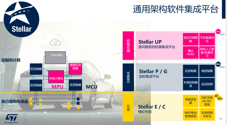 意法半导体最新的Stellar车规MCU平台,根据汽车电气架构发展趋势分为三个级别的产品。硬件底层执行层级的MCU是Stellar E/C系列,主要强调可靠性与模拟性能,应用于电驱逆变器、充放电管控、BMS电池管理,以及车身控制与安全等领域;功能集成层级是Stellar P/G系列,主要强调实时性和功能集成度,应用于车身控制集成、运动控制以及区/域控制器等;面向服务的高性能计算层级是Stellar UP系列MPU,主要应用于实时车辆决策、汽车能源优化、雷达AVAS,以及高级人工智能/机器学习领域。