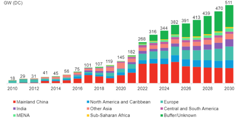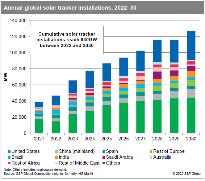 根据IHS对跟踪支架的市场预测,2023年跟踪支架的安装量将迎来一次快速上升,同时未来也将保持较高的成长速率。如果按照地面电站占总装机容量的一半来看,2023年全球的跟踪支架应用将接近40%。
