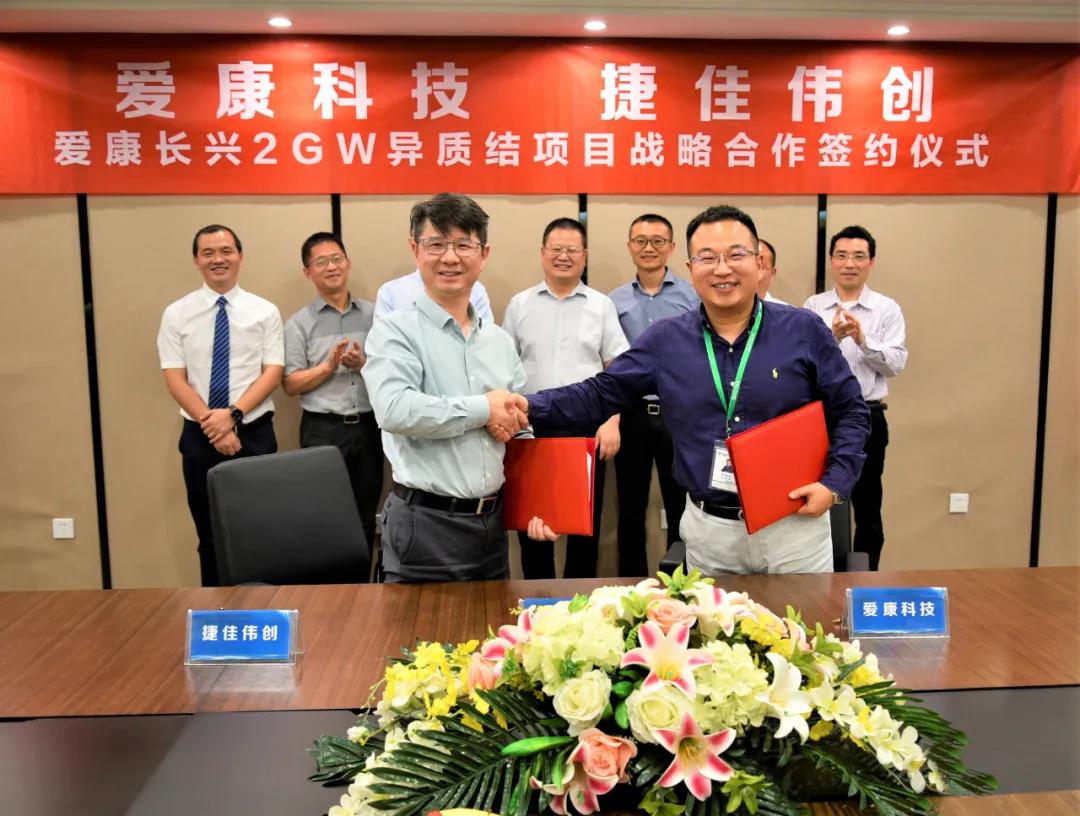 5月30日,爱康科技与捷佳伟创正式签署爱康长兴2GW异质结电池项目战略合作框架协议,双方共同探索在HJT异质结技术领域的深入合作。捷佳伟创董事长余仲、副总经理左国军,爱康科技董事长邹承慧、总裁史强、副总裁张金剑等双方领导出席签约仪式。爱康HJT项目开始从产业布局领先,逐步向技术领域创新突破的高质量方向发展。