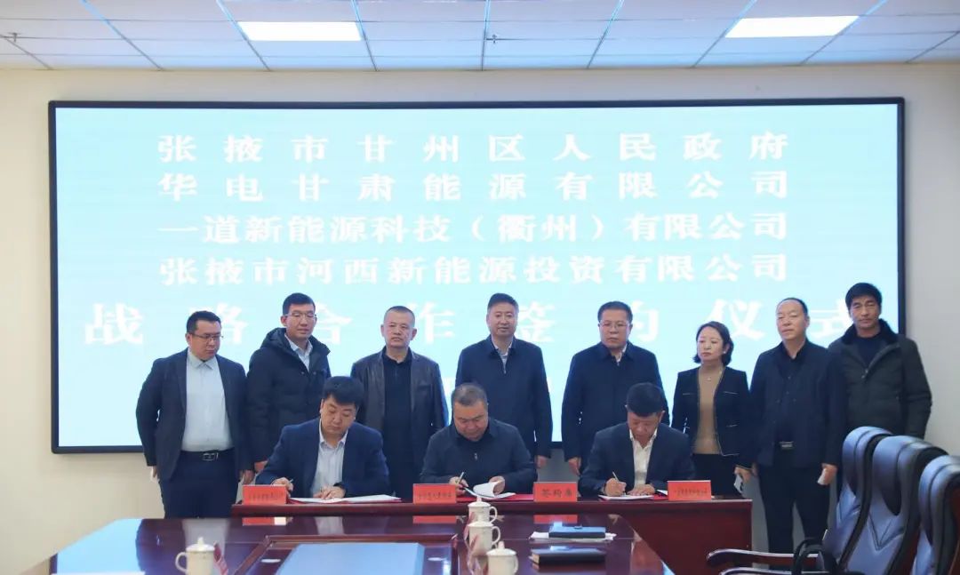 2023年1月10日,一道新能携手张掖市甘州区人民政府、华电甘肃能源有限公司、张掖市河西新能源投资有限公司签署5GW光伏组件生产基地战略合作协议。张掖市委常委、区委书记葛永宏,区委副书记、区长赵新福,华电甘肃能源有限公司规划发展部项目筹备处主任杨轩,一道新能董事长特别助理王春华,张掖市河西新能源投资有限公司总经理杨涛等相关领导出席签约仪式。