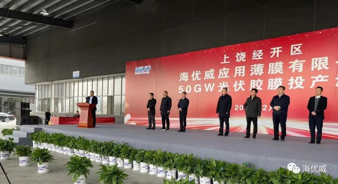 2月15日下午三点,海优威在江西上饶工厂隆重举行上饶海优威应用薄膜有限公司50GW光伏胶膜投产仪式。上饶市市委陈云书记,邱向军市长携其他政府相关部门领导,海优威总经理李民,以及众多合作伙伴共同出席了本次投产仪式。