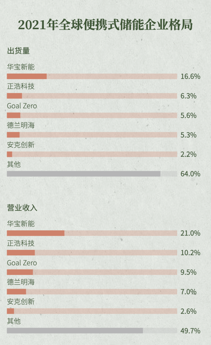 值得注意的是,2021年在全球便携储能企业出货量市场份额前五名中,有四家中国企业,其中华宝新能表现突出。