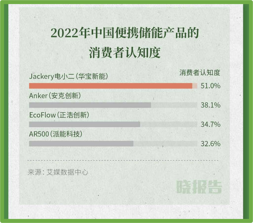 与此同时,《报告》指出,当前很多中国消费者对便携储能的认知度不高。行业机构数据显示,2022年中国消费者在购买便携储能产品时,最看重的前两大元素是品牌知名度和价格,而非产品功能、性能、安全性等更加实际的因素。这意味着,在选购便携储能设备时,很多国内消费者尚缺乏辨别产品性价比高低的判断能力。目前,中国便携储能品牌中,Jackery电小二是消费者相对更熟悉的品牌。