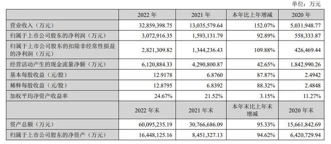 3月9日晚间,宁德时代披露2022年全年业绩。报告期内公司营收达到3285.94亿元,同比增长152.1%,归属于上市公司股东的净利润为307.3亿元,同比增长92.9%。