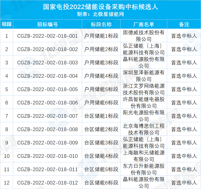 据获悉,3月10日,国家电投2022年度900MWh储能设备采购中标结果公示,12个标段共十家企业入选成为中标候选人,弘正储能和晶科能源分别夺得两个标段。