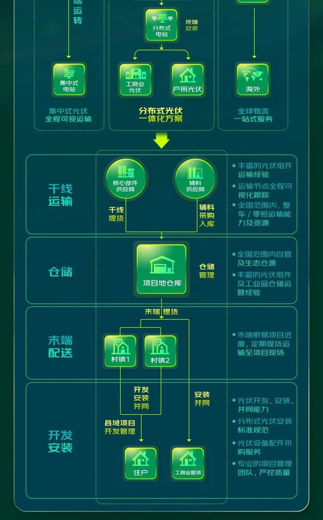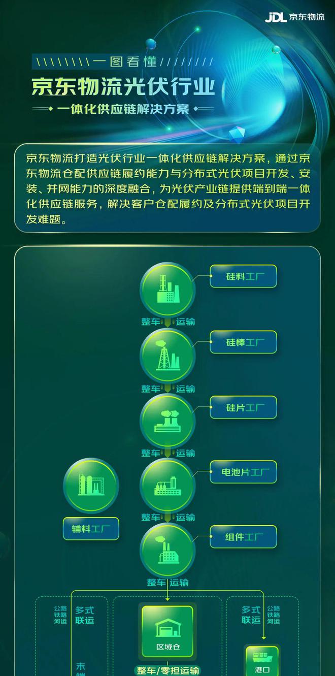 基于多年服务光伏行业中的深入洞察,近日,京东物流针对光伏行业迭代升级一体化供应链解决方案。通过“供应链全环节+数字化服务”方式,在助力光伏企业提升供应链效率的同时,降低供应链管理难度及履约成本,同时针对分布式光伏项目,提供集干线运输、仓储、配送、开发、勘测、安装及并网的一体化供应链解决方案,协助企业解决末端服务难题。