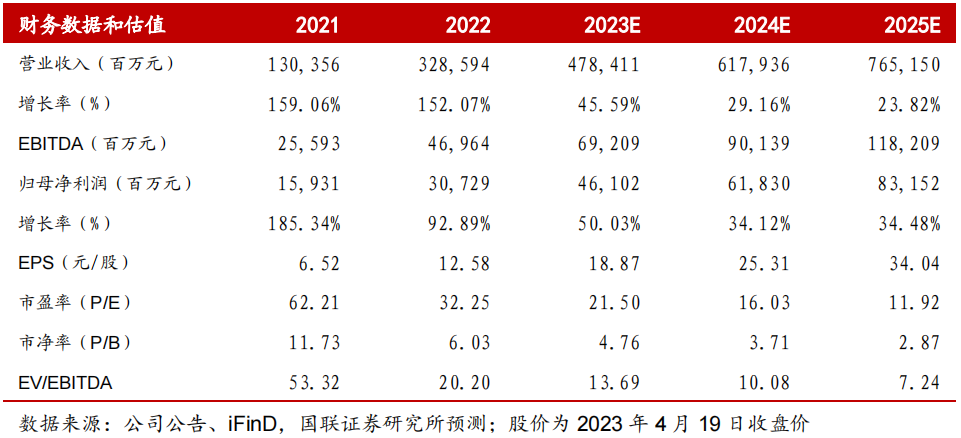 我们维持对公司的盈利预测,预计2023-25年收入分别为4784.11/6179.36/7651.50亿元,对应增速45.59%/29.16%/23.82%;归母净利润分别为461.02/618.30/831.52亿元,对应增速50.03%/34.12%/34.48%,三年CAGR为39%;EPS分别为18.87/25.31/34.04元/股,对应PE分别为21.5/16.0/11.9倍。参照可比公司相对估值及绝对估值结果,我们维持公司23年34倍PE,目标价641.58元。维持“买入”评级。
