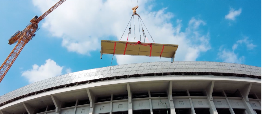 单元板块内部主龙骨选用氟碳喷涂钢方管,外饰面板有铝单板、光伏玻璃系统等,将龙骨与幕墙材料组成超大单元板块,最终实现单元体的装配式安装,实现了光伏建筑一体化,让建筑自己发电,助力打造一座绿色、低碳的现代化场馆。