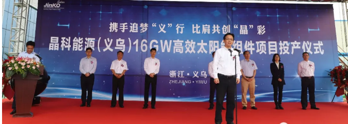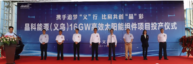 5月30日上午,晶科能源(义乌)16GW高效太阳能组件项目投产仪式举行。晶科能源控股有限公司高管陈康平、徐志群、谢冠森、郭亦桓、张洪,义乌市领导林毅、王健、虞秀军、贾文红出席仪式。金华市委常委、义乌市委书记林毅和晶科能源首席执行官陈康平分别致辞,晶科能源首席运营官徐志群宣布晶科能源(义乌)16GW高效太阳能组件项目正式投产。