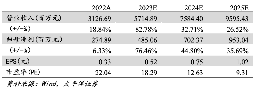 随着国内海上风电和新疆等区域陆上风电需求上涨,泰胜风能公司积极进行产能布局和扩张,并将2023年度的塔筒业务(含其他海上风电及海洋工程装备)总产量目标定为70万吨,预计将推动其业绩快速增长。我们预计2023-2025年公司营收分别为57.1/ 75.8/ 96.0亿元,同比+82.8%/ +32.7%/ +26.5%;归母净利分别为4.9/ 7.0/ 9.5亿元,同比+76.5%/ +44.8/ +35.7%;EPS分别为0.52/0.75/1.02元,当前股价对应PE分别为18/ 13/ 9倍,首次覆盖给予“买入”评级。