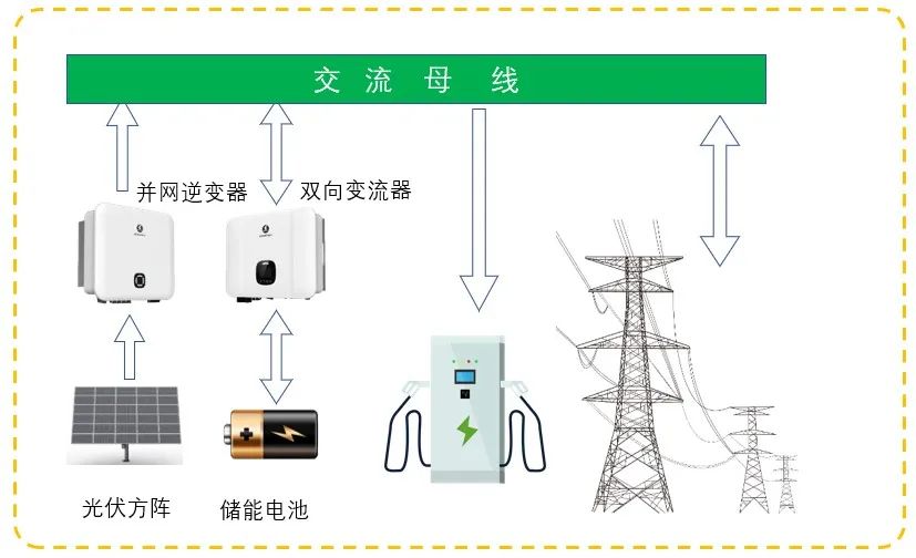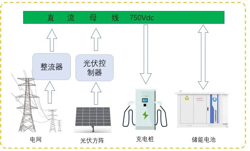 直流母线解决方案原理:光伏组件通过控制器,变成750Vdc的直流电,存储于储能电池中,充电桩输入是直流接口,直接给电动汽车充电,当光伏不足时,还可以由电网通过整流器给电池补充能量。