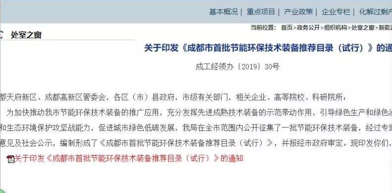 《成都市首批节能环保技术装备推荐目录》(试行)是成都市经信局为加快推动节能环保技术装备的应用,充分发挥先进成熟技术装备的示范带动作用,引导绿色生产和绿色消费,增强打赢污染防治和生态环境保护攻坚战能力,促进城市绿色低碳发展而实施的一项工程。目录在全市范围内公开征集了一批节能环保技术装备,经过专家评审、现场核查、征求意见及社会公示后进行公布。
