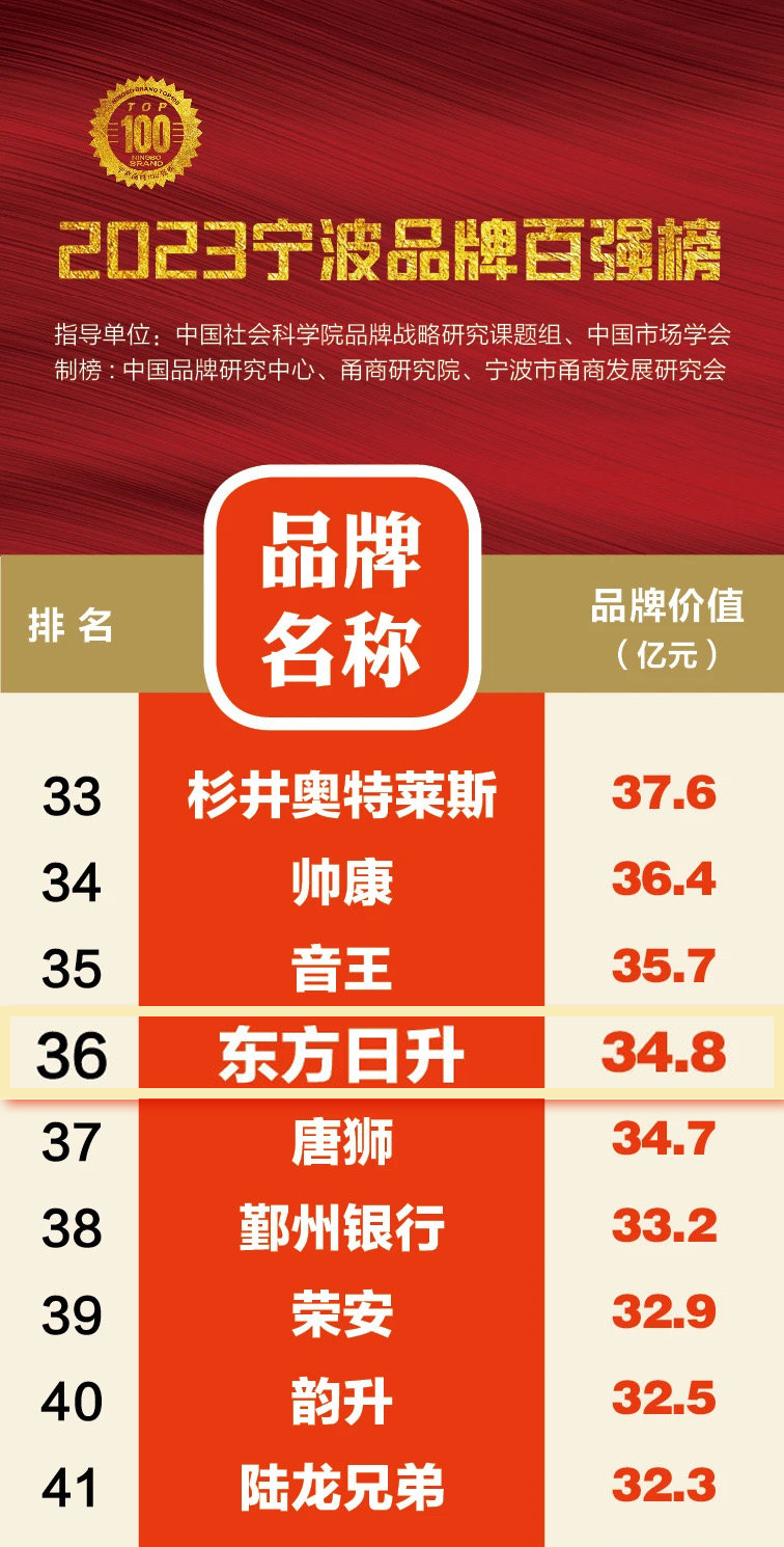 宁波品牌百强榜已连续发布十年,今年在总价值和上榜门槛上均有新突破。100个上榜企业总价值突破4730.5亿元,上榜门槛达5亿元。东方日升以34.8亿元的品牌价值荣登总榜第36位。