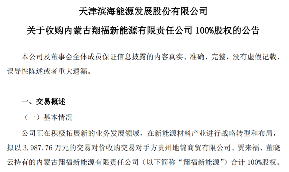 5月22日,滨海能源公告,公司拟以3987.76万元的交易对价收购交易对手方贵州地锦商贸、贾来福、董晓云持有的翔福新能源合计100%股权。