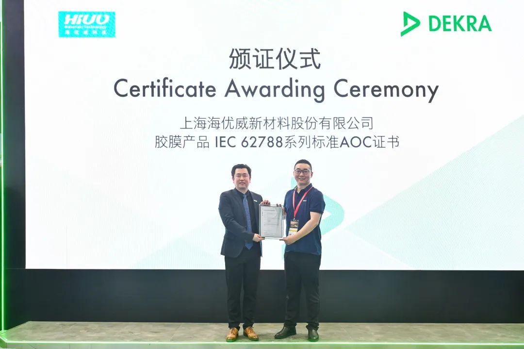优质认证!上海海优威新材料获得由DEKRA德凯颁发的光伏胶膜AOC证