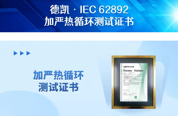 热循环测试是一项广泛使用的评估光伏组件耐久性的方法。测试过程中,光伏组件会在高温和低温之间循环暴露,以模拟光伏组件在日常使用中经历的温度变化循环。通过这种方式,可以评估光伏组件在不同温度条件下的性能和可靠性。IEC 62892的加严热循环测试正是模拟了严酷高温的环境,其测试强度相当于IEC 61215中热循环500次测试,DeepBlue 4.0 Pro产品在德凯通过这该项测试,更加彰显了晶澳优良的生产质量以及组件运行的稳定性。