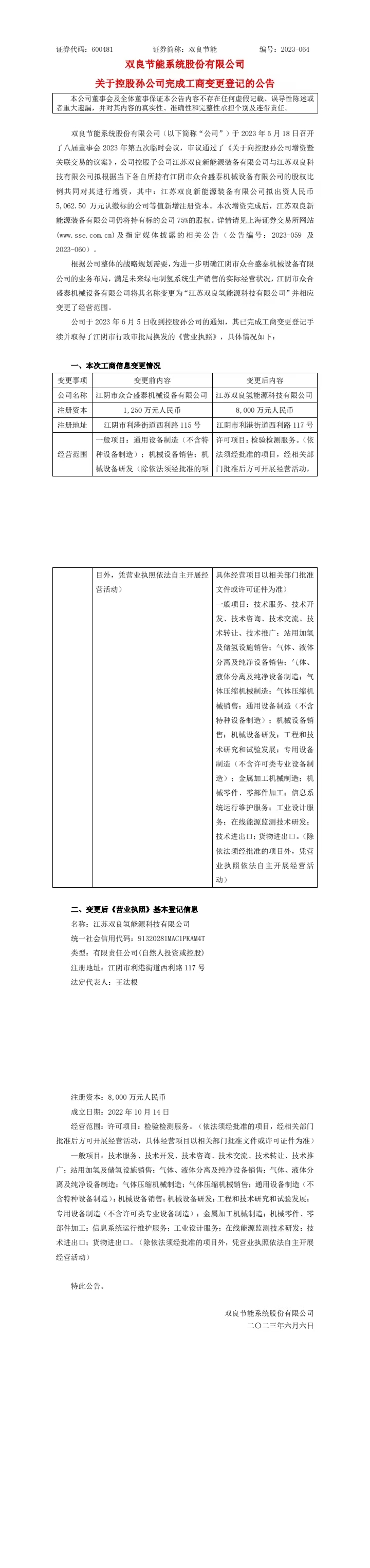 向氢而动!双良节能控股孙公司完成工商变更登记