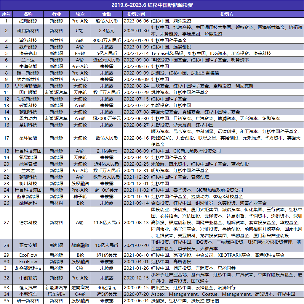 据不完全统计,在2019年6月至今的四年里,红杉资本在包含新材料、新能源车等在内的新能源领域,已参与有超30起投融资事件。
