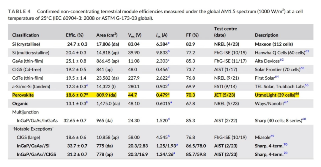 近日,在《Solar Cell Efficiency Tables》发布的2023年年中最新光伏效率纪录榜单中,极电光能809.9cm²大尺寸钙钛矿组件以18.6%的稳态效率再次创造新的世界纪录,这一结果也经过全球权威测试机构JET的严格检测认证。