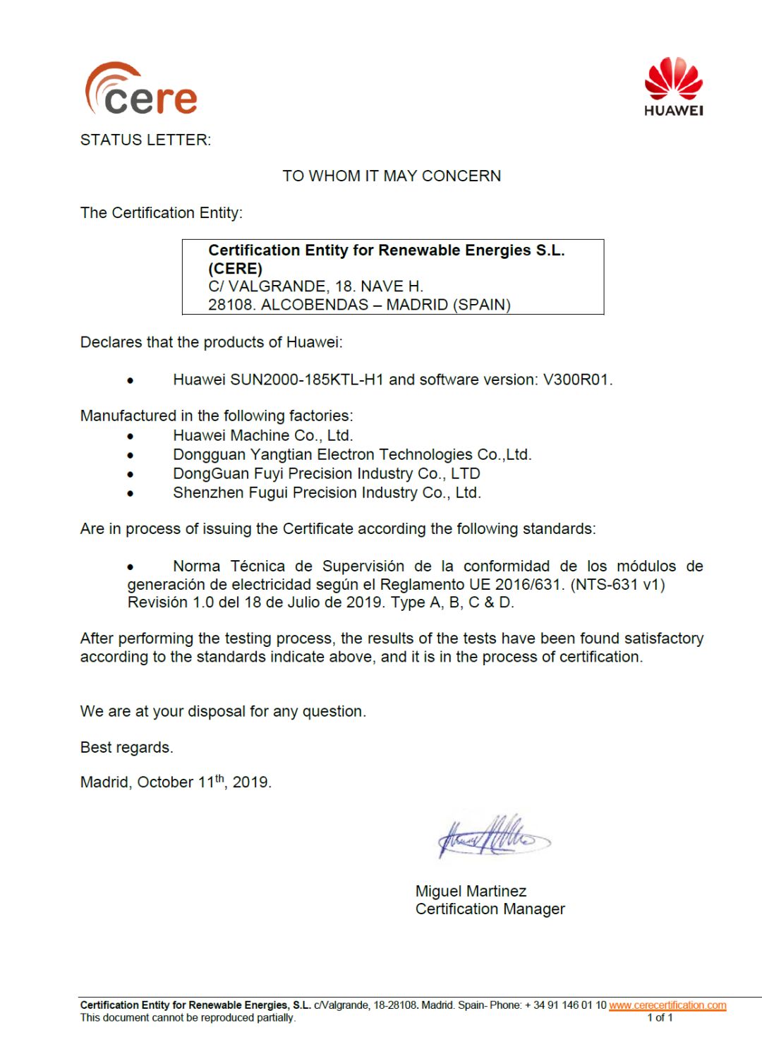 随着并网标准的不断发展和演进,CERE(可再生能源认证实体,S.L)宣布华为SUN2000-185KTL-H1光伏逆变器已经顺利通过NTS测试——支撑西班牙电网安全电力传输。华为是第一家通过西班牙新电网码NTS认证测试的厂家,凭借不断创新,在电网码准入技术上华为再一次实现领先。该认证测试报告已于2019年10月8日交付。