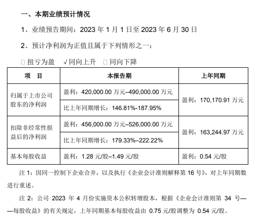 公告介绍,归属于上市公司股东的净利润420,000.00万元–490,000.00万元,比上年同期增长146.81%-187.95%;扣除非经常性损益后的净利润456,000.00万元–526,000.00万元,比上年同期增长179.33%–222.22%。