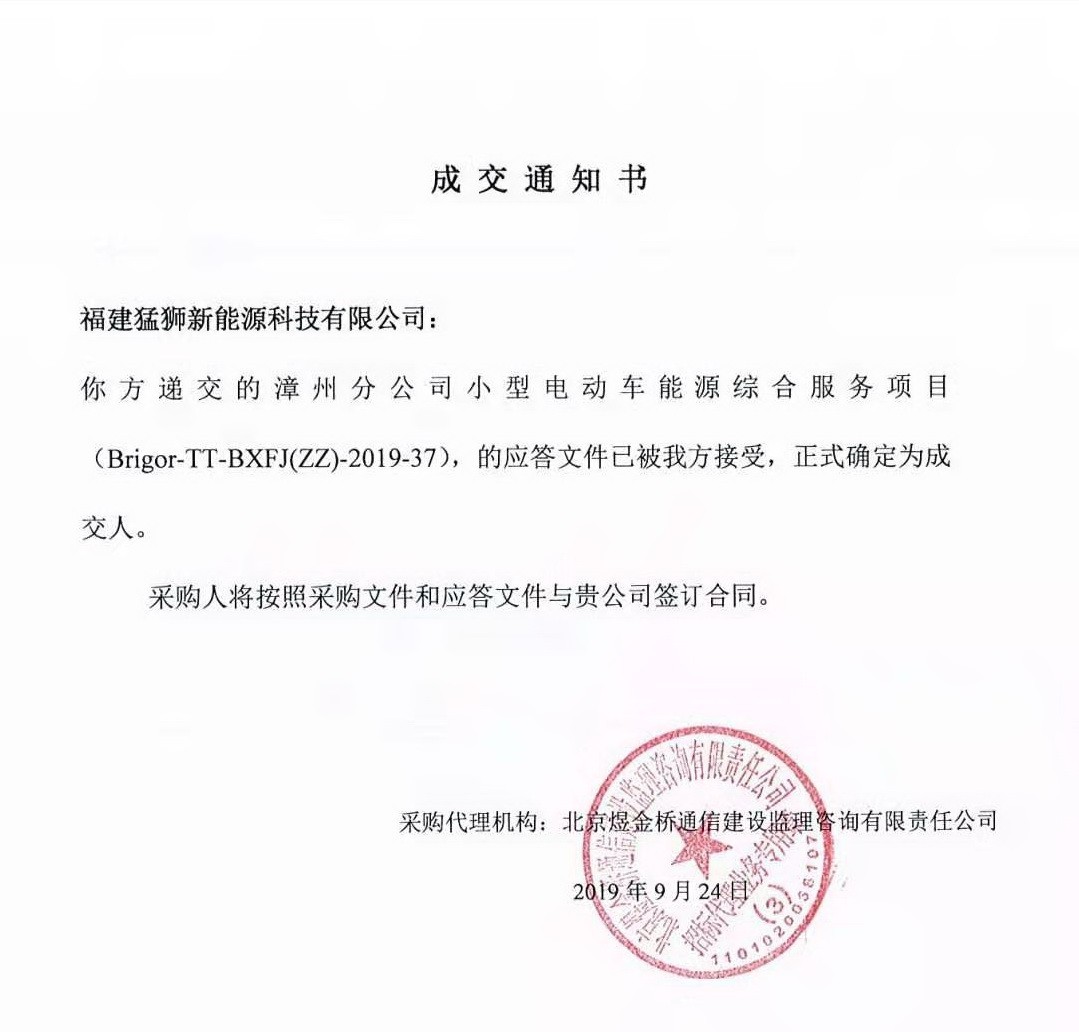 10月9日,猛狮科技旗下福建猛狮新能源收到北京煜金桥通信建设监理咨询有限责任公司发来的《成交通知书》,确认福建猛狮新能源成为中国铁塔股份有限公司漳州分公司“小型电动车能源综合服务项目”供应商。