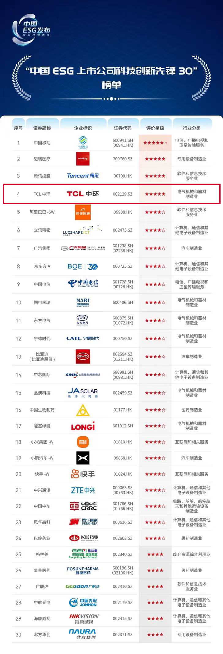 近日,中央广播电视总台财经节目中心正式发布《科技创新ESG行动报告》,在同期公布的“中国ESG上市公司科技创新先锋30”榜单中,TCL中环凭借多年来在光伏领域的持续深耕和ESG领域的长期投入及卓越表现入选榜单,位列第4名,排名位于中国光伏行业第一。
