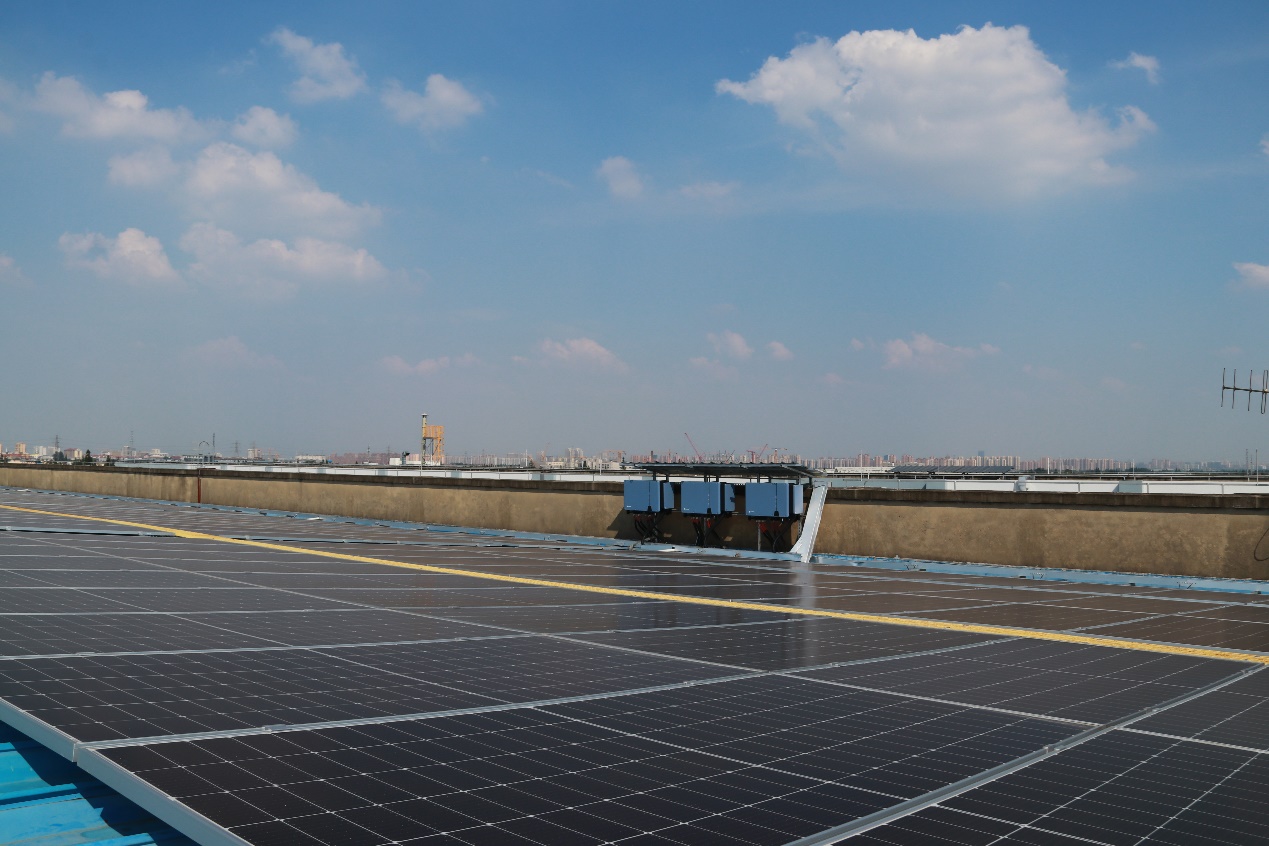 天朗气清,惠风和畅,宽阔的厂房屋顶上,一块块晶莹的光伏板整齐排列,在阳光的照耀之下熠熠生辉——这里是上海嘉定综合保税区首个分布式光伏电站。在10000平米的厂房屋顶之上,2637块光伏板正在默默地将阳光转化成电能,源源不断地为园区提供着清洁的动力。