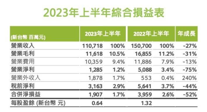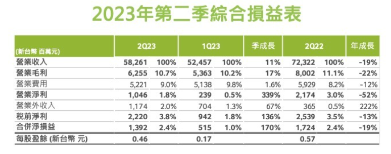 董事会3日已通过2023年第二季财报,总营收582.61亿元、季增11%、年减19%,毛利62.55亿元、季增17%,毛利率季增至10.7%,营业净利10.46亿元、季增339%,税后净利13.92亿元、季增170%,每股盈余0.46元高于去年同期的0.17元。由于业绩在5月前后出现反转,使第二季表现较第一季有所增长。