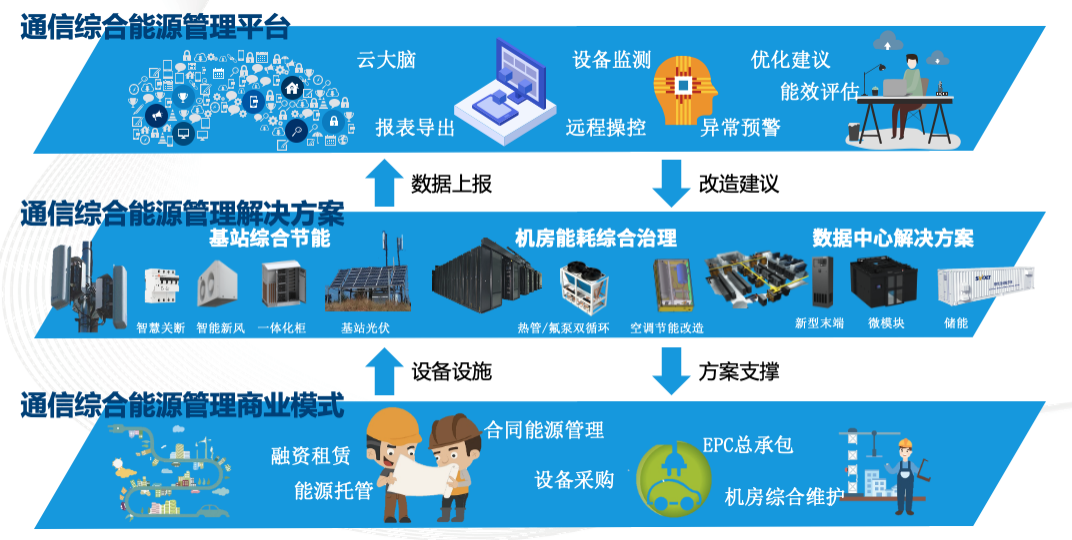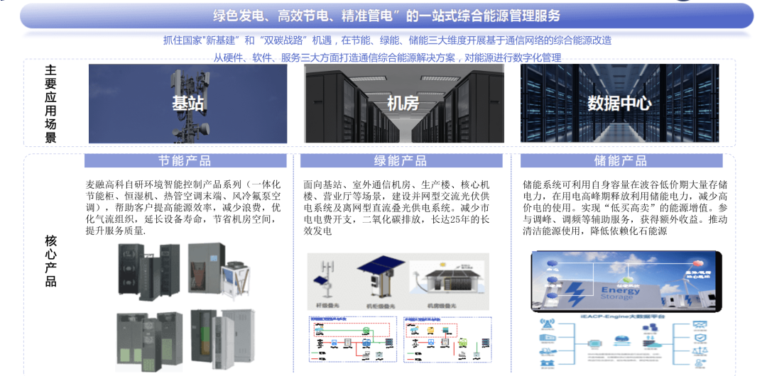 润建股份通信综合能源管理服务体系,同时面向基站和通信机房、数据中心,为客户提供设计勘查、低碳设备、工程施工、运行维护和综合管理一体化服务,帮助实现基站综合节能、机房能耗综合治理,同时提供数据中心能源解决方案。