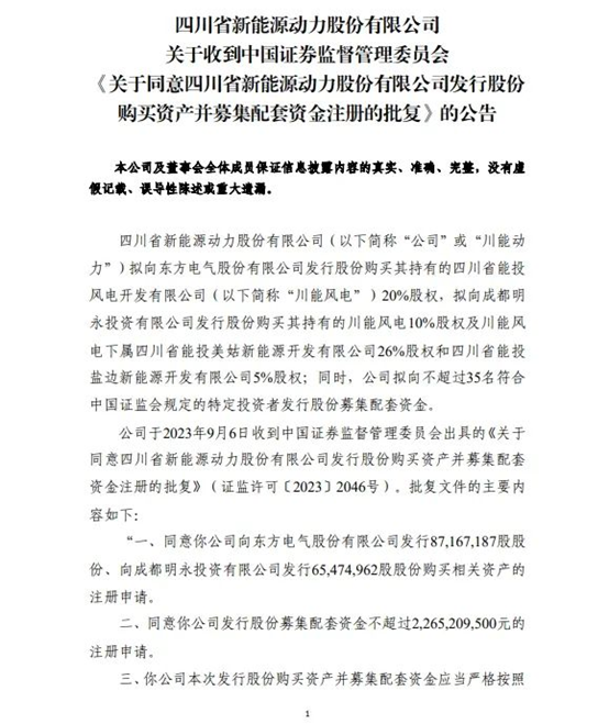 9月6日,四川省新能源动力股份有限公司(简称“川能动力”,SZ:000155)发布了《关于同意四川省新能源动力股份有限公司发行股份购买资产并募集配套资金注册的批复》公告。