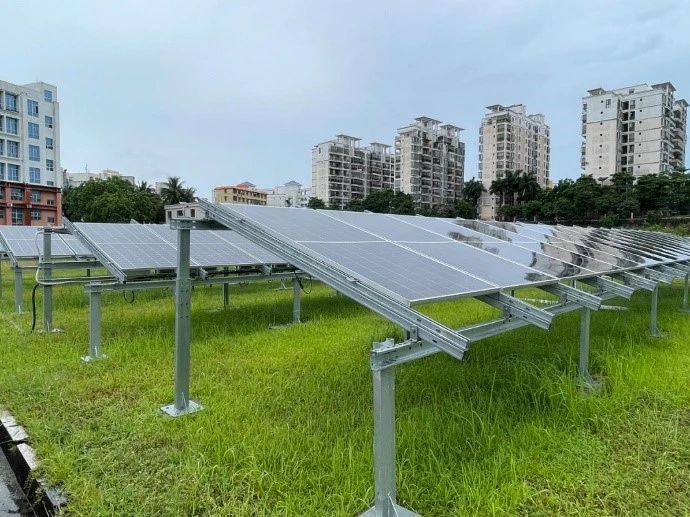 实证电站位于海南省琼海市,属热带季风气候,为典型的高温湿热环境,年平均峰值小时数1550kWh/m2(水平面)左右,年平均日照时数2155小时左右,年平均温度24℃左右。实证项目如图1所示。